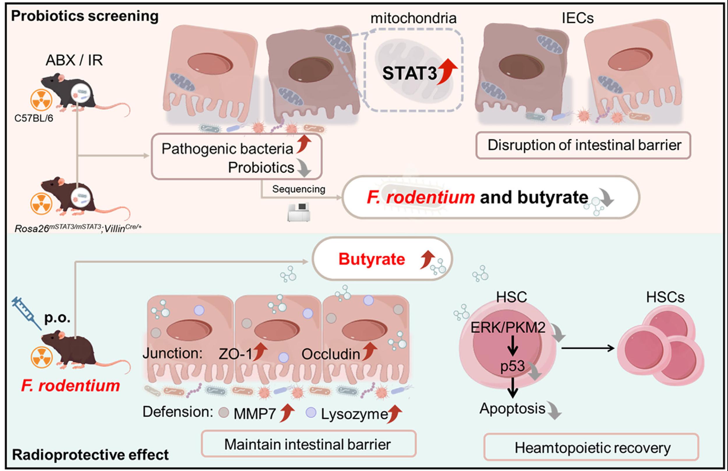 Ionizing radiation can cause severe damage to the body, especially to the intestinal tract and hematopoietic system. Although the gut microbiota plays a key role in alleviating radiation-induced damage, the specific bacterial species that exert the core protective effect and their underlying molecular mechanisms remain unclear. This study found that Faecalibaculum rodentium—a probiotic strain screened through multiple models—can alleviate ionizing radiation-induced damage in mice. Mechanistically, Faecalibaculum rodentium can promote the production of butyrate through both direct and indirect effects: on the one hand, butyrate maintains the integrity of the intestinal epithelium by upregulating the levels of tight junction proteins (such as ZO-1 and Occludin) and defensins; on the other hand, butyrate can inhibit p53-mediated apoptosis in hematopoietic stem cells by maintaining ERK-dependent nuclear translocation of PKM2. Through the aforementioned effects, Faecalibaculum rodentium and its metabolite (butyrate) can ultimately alleviate ionizing radiation-induced intestinal and bone marrow damage, and reduce the mortality rate of mice. This study provides a solid theoretical basis for the treatment of ionizing radiation-induced damage, offers new insights into ionizing radiation protection strategies, and also provides data support for the clinical application of probiotics.