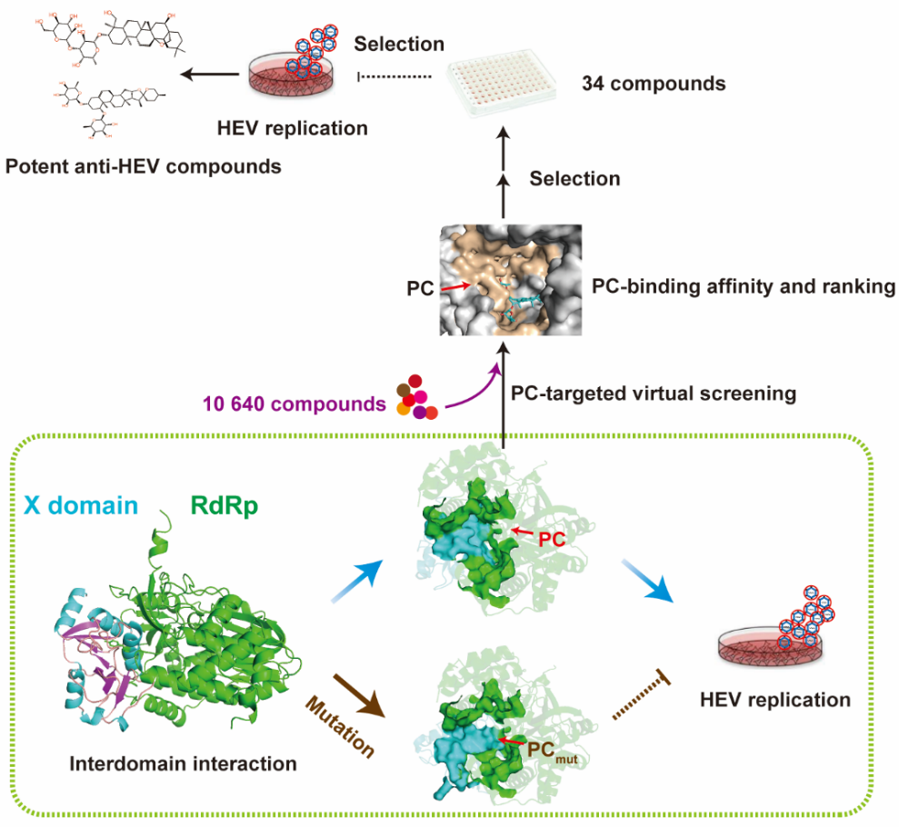 This study reveals, for the first time, a novel structure within the ORF1 polyprotein of Hepatitis E Virus (HEV)—a "pocket-like cavity" formed between the X domain and the RNA-dependent RNA polymerase (RdRp). Functional experiments confirm that this "pocket" is indispensable for viral replication. Based on this discovery, a high-throughput in silico screening platform targeting this "pocket" was further established, verifying that "targeting the cavity at the viral protein interface" can serve as an efficient new antiviral strategy.