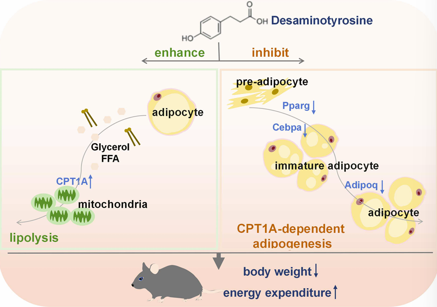 White adipose tissue plays a crucial role in maintaining lipid homeostasis in the body; its dysfunction disrupts lipid balance and induces obesity. Our study revealed that an unhealthy diet, particularly a high-fat diet, leads to intestinal microbiota dysbiosis and impaired tyrosine metabolism, resulting in reduced production of desaminotyrosine (DAT), a microbial metabolite. DAT was found to inhibit weight gain induced by a high-fat diet in mice, which is closely associated with its dual role in regulating white adipose tissue remodeling. On one hand, DAT enhances the autonomous lipid metabolism capacity of mature white adipocytes through sustained lipolysis and upregulation of the expression of CPT1A, a member of the carnitine palmitoyltransferase I family. This effect is particularly pronounced under lipolysis-inducing conditions. On the other hand, DAT blocks the differentiation process of white adipocytes by enhancing the fatty acid oxidation (FAO)-dependent pathway. This work provides new insights for developing pharmacological strategies targeting white adipocyte plasticity to treat metabolic diseases.